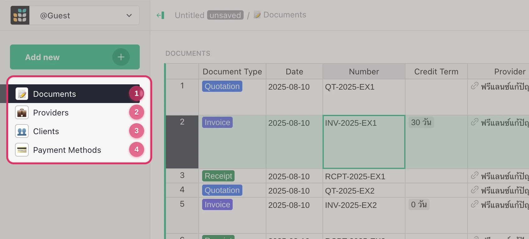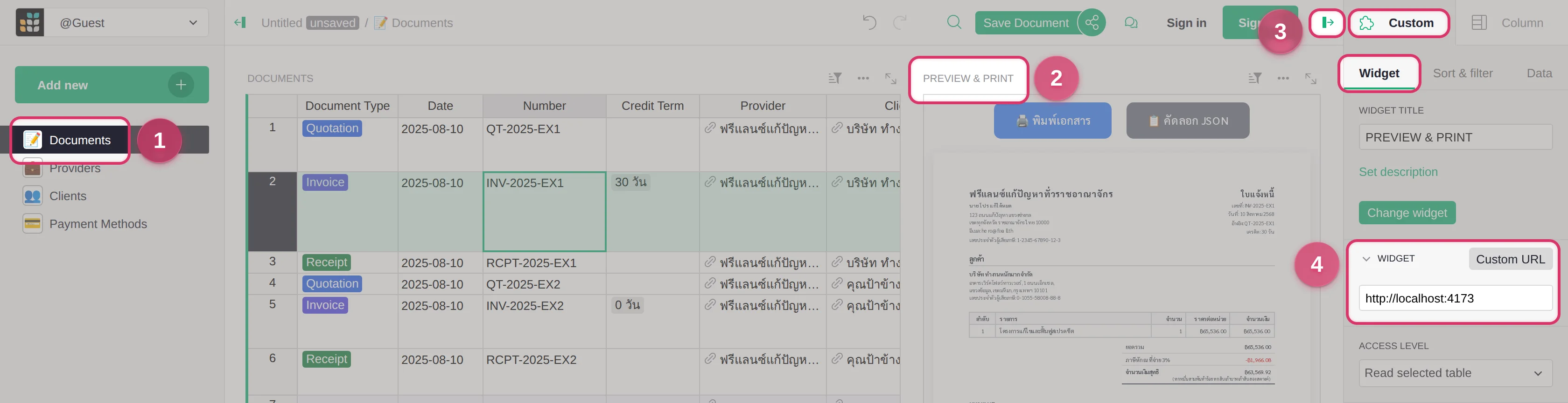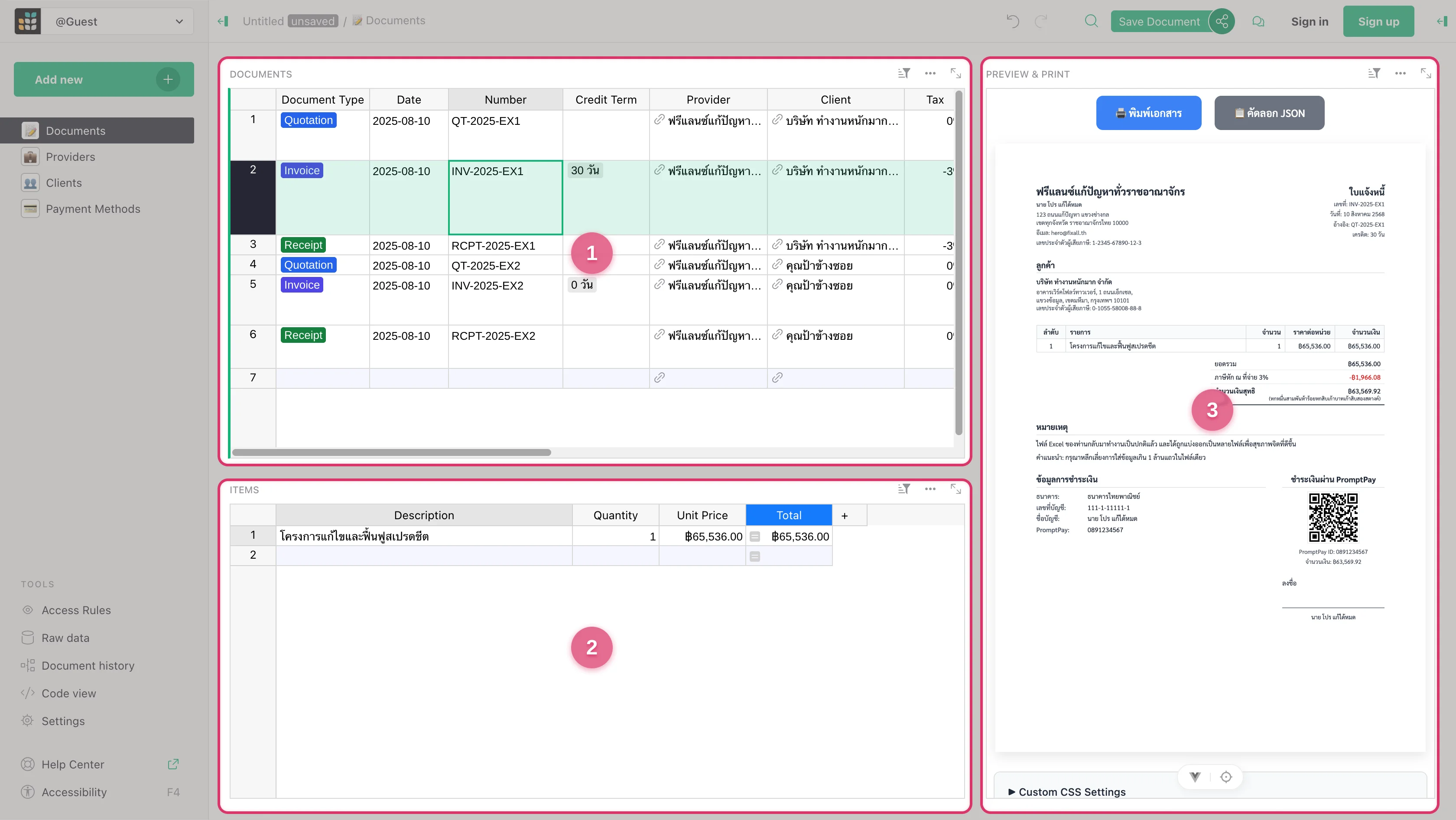 ในตัว Template เราได้เตรียมข้อมูลตัวอย่างในแต่ละหน้าไว้ให้เรียบร้อยแล้ว (ทั้ง Documents, Providers, Clients, และ Payment Methods) เดี๋ยวเราจะมาลองออกเอกสารกันดู