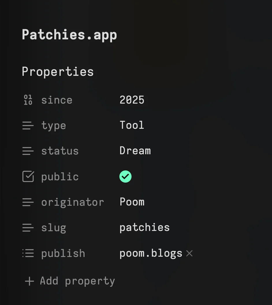 - Properties are used to add metadata to notes, allow for filtering and determining which notes should be published (image)